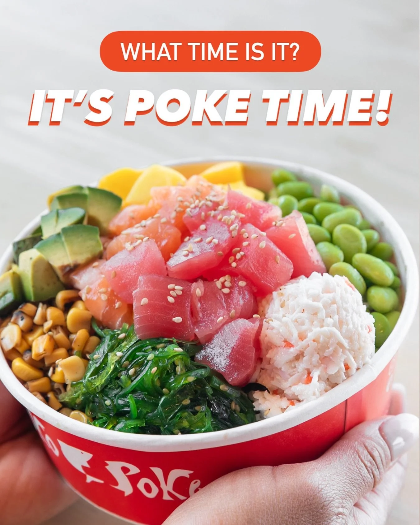 “Poke” means “cut into pieces” and the name refers to the slices or cubes of raw fish that are served in a bowl along with rice, dressing, vegetables, and seasonings. Traditionally, poke is made with ahi tuna, but can also be made with marinated salmon, cooked shrimp or even tofu for a vegan option.